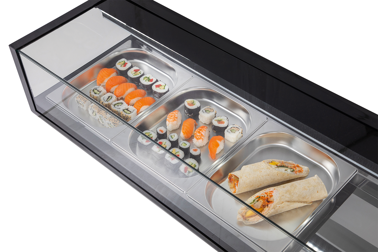 Außenmaterial Kunststoff schwarz und Glas. Innenmaterial CNS. Elektronische Steuerung. Digitale Temperaturanzeige. Berohrte Wanne. Automatische Abtauung. Deckenverdampfer mit Tauwasserverdunstung. Rückschiebescheiben. LED-Innenbeleuchtung. Stille Kühlung. Inklusive 4x 1/3 GN Schalen. Abmessungen außen (B x T x H) 1177 x 426 x 296 mm. Temperaturbereich von 0 °C bis 12 °C. Bestückungsmöglichkeit GN 1/3. Außenmaterial Kunststoff / Glas. Innenmaterial CNS. Anschlußwert 0,19 kW 230 Volt. Bruttogewicht 37 Kg. Serienzubehör Rückschiebescheiben, 4 x GN 1/3 Behälter. Kältemittel R 600a (Isobutan)/GWP 3. Warenpräsentationsfläche (TDA) 0,15 m². Energieverbrauch 630 KWHJ. Energieeffizienzklasse B. Energieeffizienzspektrum A bis G. Energieeffizienzindex EEI 15,0. Klimaklasse 3. Temperaturklasse M2. EPREL Registrierungsnummer 2294125. EU-Labelverordnung 2019/2018.