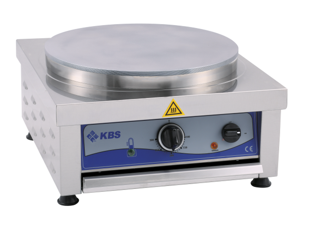 Außengehäuse Edelstahl. Temperatur stufenlos regelbar von +50 °C bis +300 °C. Betriebs- und Temperaturkontrollleuchte. Graugussplatte teflonbeschichtet. Ein-/Ausschalter. Mit Aufbewahrungsschublade. 1 Teigverteiler aus Holz. Plattendurchmesser: Ø 40 cm. Abmessungen außen (B x T x H) 900 x 500 x 220 mm. Temperaturbereich von 50 °C bis 300 °C. Außenmaterial CNS, Kunststoff, Grauguss. Anschlußwert 6 kW 230 Volt. Bruttogewicht 44 Kg. Serienzubehör 1 Teigverteiler aus Holz.