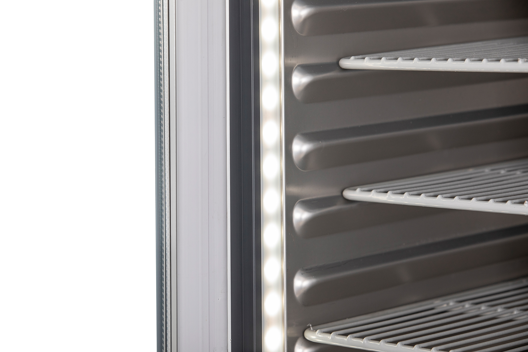 Europäisches Markenprodukt. Glastürkühlschrank. Elektronische Steuerung. Innenbeleuchtung. Innenraum mit vorgeformten Auflageschienen. Umluftkühlung. Beschichteter Verdampfer im Innenraum. Tauwasserverdunstung. Innenraum mit abgerundeten Ecken. Roste GN 1/1 beschichtet. Selbstschließende Tür. Türschloss oberhalb der Tür. Glastür doppelt isoliert mit Griff. Türanschlag links. Eingelassene und ergonomisch geformte Griffleiste. Tauwasserverdunstung. Leicht wechselbare Türmagnetsteckdichtung. Wartungsfreundliche klappbare Maschinenfachblende. Höhenverstellbare Ausgleichsfüße aus CNS 125 bis 200 mm zur Selbstmontage. Abmessungen außen (B x T x H) 460 x 665 x 2075 mm. Temperaturbereich von 2 °C bis 8 °C. Bestückungsmöglichkeit GN 1/1. Außenmaterial Edelstahl AISI 304 zweiseitig, Glastür mit Doppelisolierverglasung. Innenmaterial Edelstahl AISI 304. Anschlußwert 0,213 kW 230 Volt. Bruttogewicht 105 Kg. Serienzubehör 4 Roste rilsaniert und Türschloss. Kältemittel R 290 (Propan)/GWP 3. Nutzinhalt Kühlung 227 Liter. Energieverbrauch 825 KWHJ. Energieeffizienzklasse E. Energieeffizienzspektrum A +++ bis G. Klimaklasse 4. EU-Labelverordnung 2015/1094-IV.