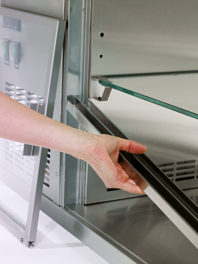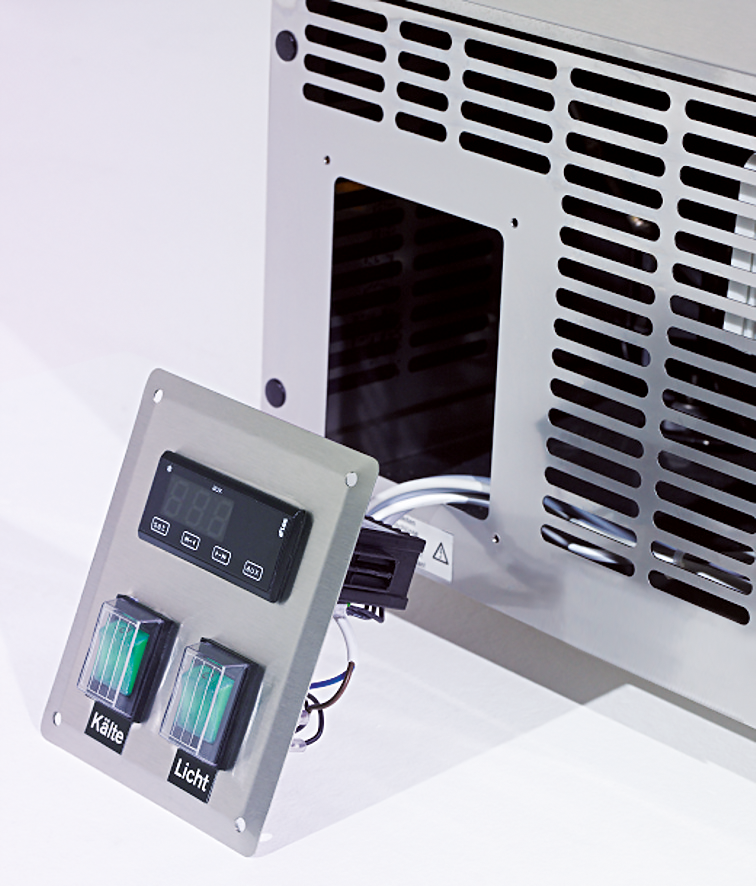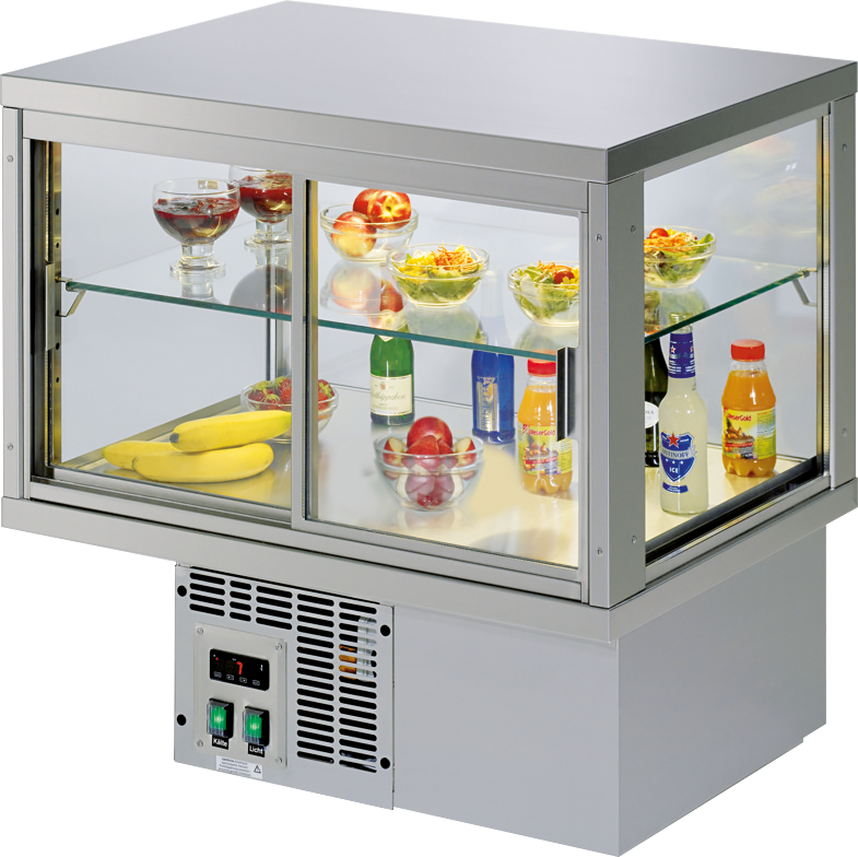 Maßangaben beziehen sich auf den Glasaufbau. Ausschnittsmaß 600 x 560 mm. Lufteintritts- und Luftaustrittsöffnungen sind bauseits zu erstellen und je mit mind. 350 cm² bei geschlossenen Unterbauten auszulegen. Bedienelement zum Einbau in Arbeitsplatten oder Schrankkorpusse abnehmbar und bis max. 50 cm vom Gerät platzierbar, Ausschnittsmaß für Bedienelement B x H 100 mm x 120 mm. Verkaufsfördernde Präsentation von Snacks. 17 mm Isolierverglasung, 3-seitig. Digitale Temperaturanzeige. Elektronische Temperaturregelung. Außen- und Innenmaterial aus CNS. Automatische Abtauung und Tauwasserverdunstung. Innenbeleuchtung. Bedienerseitige Schiebetüren mit Isolierverglasung 14 mm. Höhenverstellbare Glaseinlegeböden. Selbstbedienungsklappen siehe Zubehör. Abmessungen außen (B x T x H) 825 x 610 x 540 mm. Temperaturbereich von 6 °C bis 12 °C. Außenmaterial CNS. Innenmaterial CNS. Anschlußwert 0,35 kW 230 Volt. Bruttogewicht 90 Kg. Serienzubehör 1 Glasablage höhenverstellbar. Kältemittel R 290 (Propan)/GWP 3.