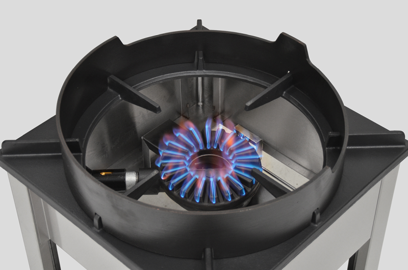 Entwickelt für Mobilität und Langlebigkeit. Perfekte Lösung für die asiatische Küche. 1 Hochleistungs-Schlitzbrenner Ø180 mm Durchmesser. Gasanschluß 3/4 Zoll. Brennerleistung 13 kW. Brennerkranz aus Gußeisen. Chromnickelstahlausführung. Ohne Wokring für Töpfe bis Ø 500mm nutzbar. Mit optionalen Wokring für Wok Pfannen von Ø 560 bis Ø 610mm nutzbar. Gas-Sicherheitsventil mit Thermoelement. Höhenverstellbare Füße. Werkseitig auf Erdgas H eingestellt. Wechseldüsen für Flüssiggas im Lieferumfang enthalten. Bitte beachten Sie bei Einsatz mit Flüssiggas wird noch ein Gasschlauch mit Druckminderer (nicht im Lieferumfang enthalten) benötigt. Abmessungen außen (B x T x H) 500 x 500 x 475 mm. Außenmaterial Chromnickelstahl, Topfhalter aus Gußeisen. Anschlußwert Gas 13 kW. Bruttogewicht 22 Kg.