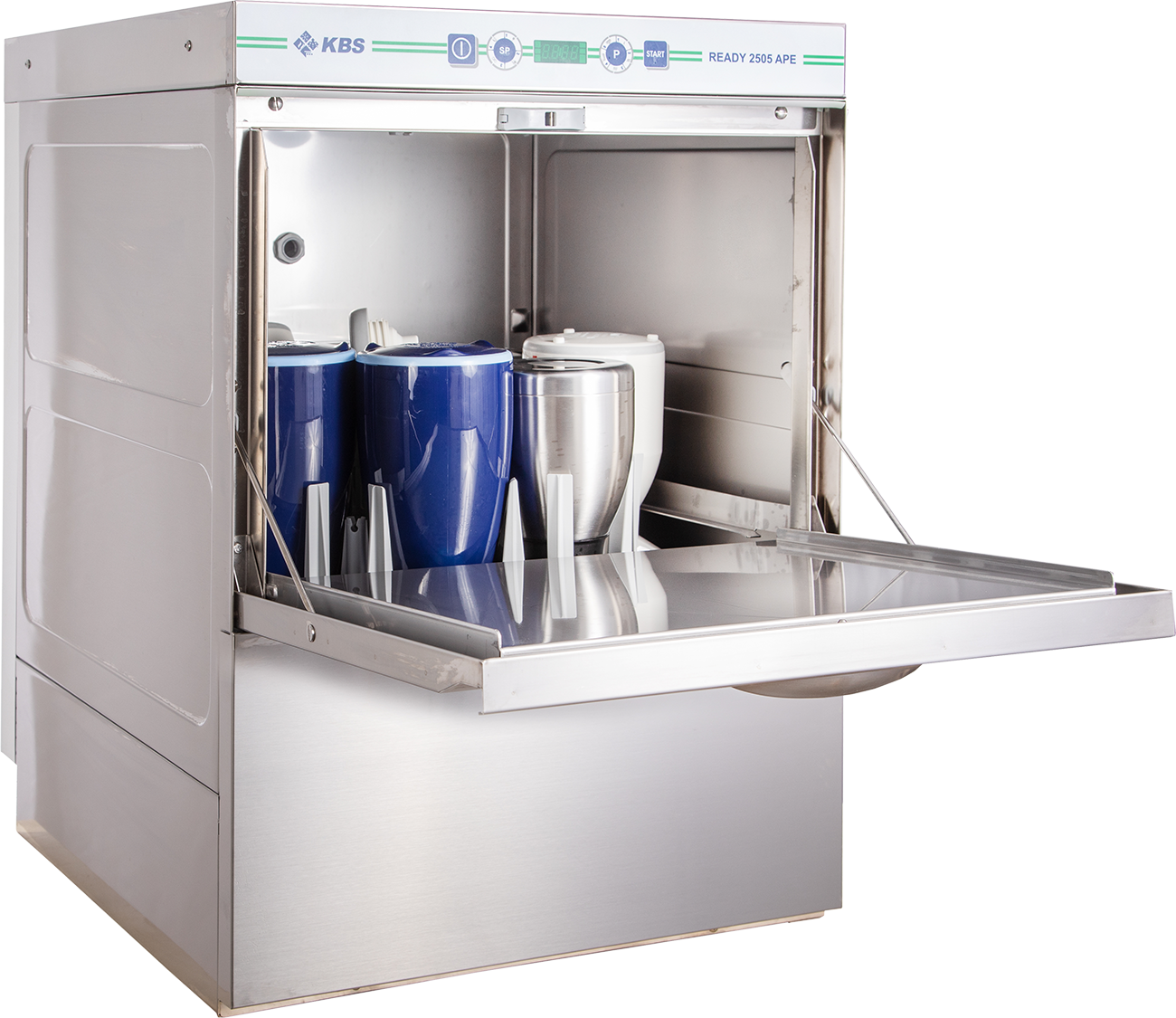 Geschirrspüler mit Thermostoppfunktion. Korbmaß 500 x 500 mm. Automatischer Enthärter. Parallel-Heating Funktion. Manuelle Boilerentleerung. Ablaufpumpe mit Teilwassertankentleerung. Drucksteigerungspumpe. Elektronisch einstellbare Klar- und Spülmitteldosierpumpe. Multicolor Funktionsdisplay. Elektronische Steuerung mit Soft-Touch Bedienung. Digitale Temperaturanzeige. Doppelwandige Konstruktion. Doppelwandige Tür mit Federentlastung. 3-Stufen-Filtersystem mit Grobreste-Trennung und Tankwasser-Niveau-Kontrolle. Tankflächenfilter. Double-Flow Waschpumpe mit Sanftanlauf. Quick-Ready-System vor Spülpumpe. Tiefgezogener Tank. Einschubhöhe max. 320 mm (Gläser). Energy Save Funktion. Smart-Spülarme aus Edelstahl• Selbstdiagnosesystem. 3 Spülprogramme und 8 Spezialprogramme. Selbstreinigungsprogramm. Zusatzprogramme für Kristallgläser + Ultraclean. Inklusive 2 Neutralkörbe und 1 Besteckkorb. Abmessungen außen (B x T x H) 600 x 600 x 820 mm. Außenmaterial Edelstahl AISI 304. Innenmaterial Edelstahl AISI 304. Anschlußwert 7,9 kW 400 Volt. Bruttogewicht 59 Kg. Serienzubehör 1 Neutralkorb, 1 Tellerkorb, 1 Besteckköcher.