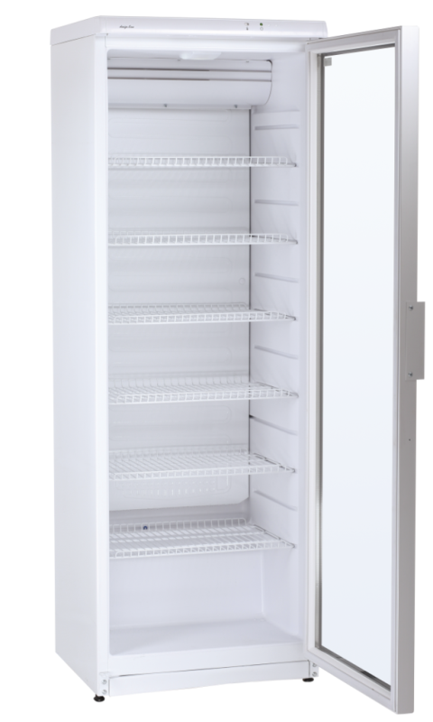 Glastürkühlschrank. Betriebskontrollleuchte. 5 Stufen Temperaturregler. Stufe 0 Kühlung ist aus Gerät ist am Stromnetz. Stufe 1 geringste Kühlung. Stufe 5 höchste Kühlung. Temperaturanzeige in der Bedienblende 0 bis 5. Umluftkühlung. Vorgeformte Rostauflagen. LED Innenbeleuchtung, separat schaltbar. Isolierglastür im Aluminiumrahmen mit Griff. Türanschlag rechts, wechselbar. Leicht wechselbare Türmagnetsteckdichtung. Vorne höhenverstellbare Ausgleichsfüße. Hinten 2 Transportrollen. Individualisierung durch Labelung auf Anfrage . Abmessungen außen (B x T x H) 600 x 600 x 1730 mm. Temperaturbereich von 2 °C bis 12 °C. Außenmaterial Stahlblech weiß pulverbeschichtet. Innenmaterial ABS Kunststoff weiß. Anschlußwert 0,23 kW 230 Volt. Bruttogewicht 72 Kg. Serienzubehör 6 Roste, weiß rilsaniert. Kältemittel R 600a (Isobutan)/GWP 3. Luftschallklasse D bei 50 dB. Bruttoinhalt 350 Liter. Energieverbrauch 744 KWHJ. Energieeffizienzklasse D. Energieeffizienzspektrum A bis G. Energieeffizienzindex EEI 49,5. Klimaklasse 3. Temperaturklasse K4. EPREL Registrierungsnummer 469623. EU-Labelverordnung 2019/2018.