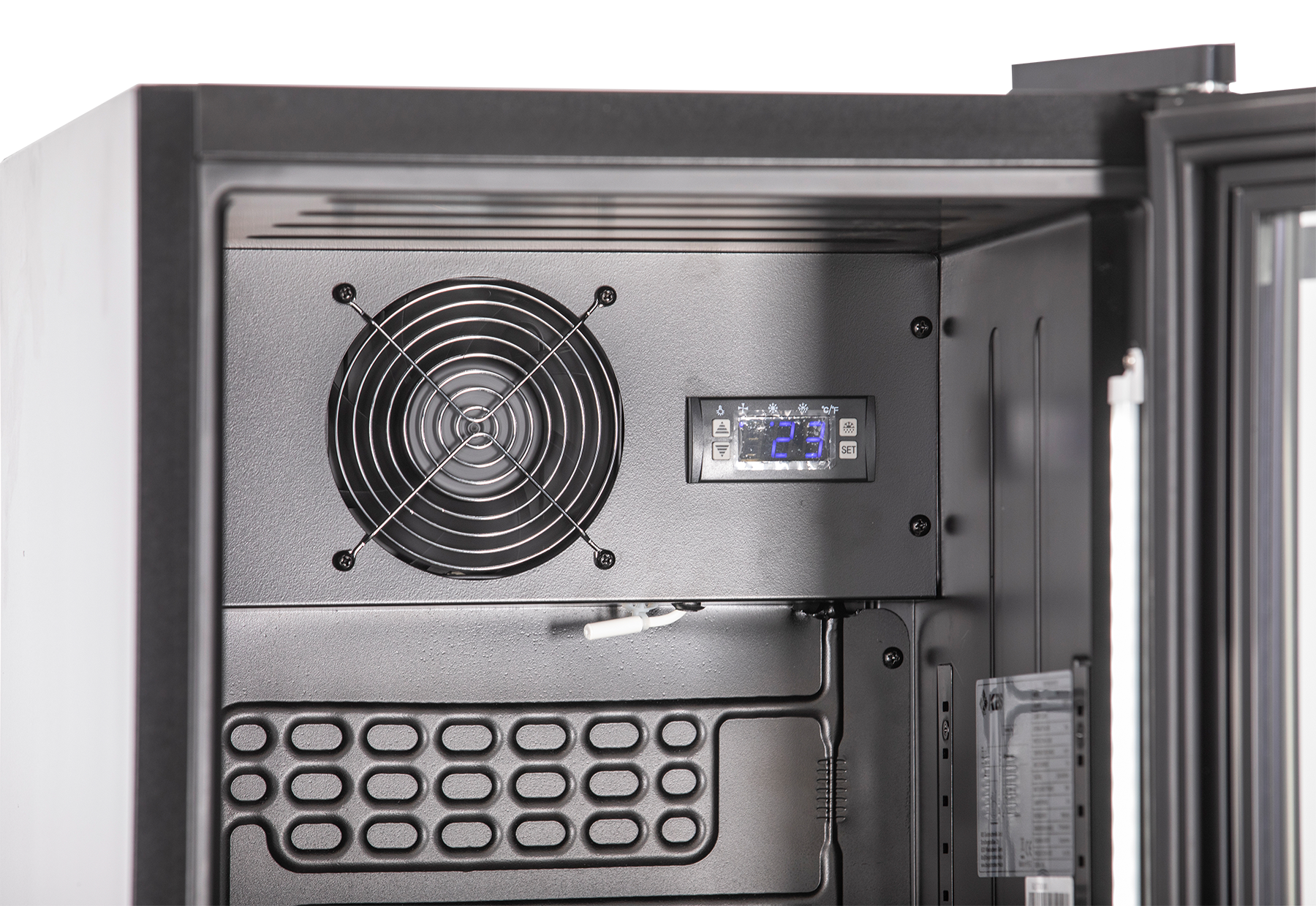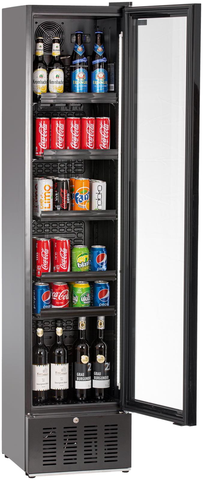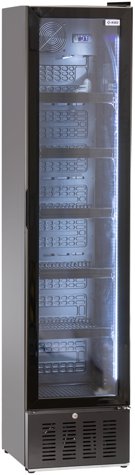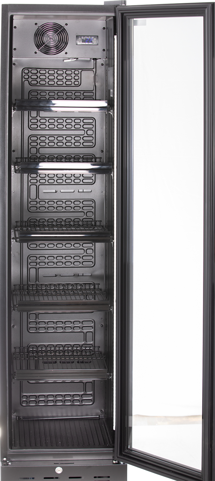 Glastürkühlschrank. Slimline Ausführung. Außergewöhnliches Design in Schwarz. Nischenbreite nur 410 mm. Digitale Temperaturanzeige. Digitales Thermostat. Vertikale LED Innenbeleuchtung, separat schaltbar. Tür 3-fach isolierverglast. Selbstschließende Tür. Tür mit Schloss. Türanschlag rechts wechselbar. Innenraum Kunststoff schwarz. Leicht zu reinigender Innenraum. 5 höhenverstellbare Roste, 1 Bodenrost. Roste mit Preisschienen ausgestattet. Automatische Abtauung. Automatische Tauwasserverdunstung. 4 höhenverstellbare Ausgleichsfüße. Individualisierung durch Labelung auf Anfrage lieferbar. Abmessungen außen (B x T x H) 405 x 435 x 1775 mm. Temperaturbereich von 0 °C bis 10 °C. Außenmaterial Stahlblech schwarz lackiert, Glastür im Rahmen 3-fach isolierverglast. Innenmaterial ABS Kunststoff schwarz. Anschlußwert 0,150 kW 230 Volt. Bruttogewicht 52 Kg. Serienzubehör 5 Roste. Kältemittel R 600a (Isobutan)/GWP 3. Nutzinhalt Kühlung 160 Liter. Energieverbrauch 500 KWHJ. Energieeffizienzklasse D. Energieeffizienzspektrum A bis G. Energieeffizienzindex EEI 43,0. Klimaklasse 3. EPREL Registrierungsnummer 2303835. EU-Labelverordnung 2019/2018.