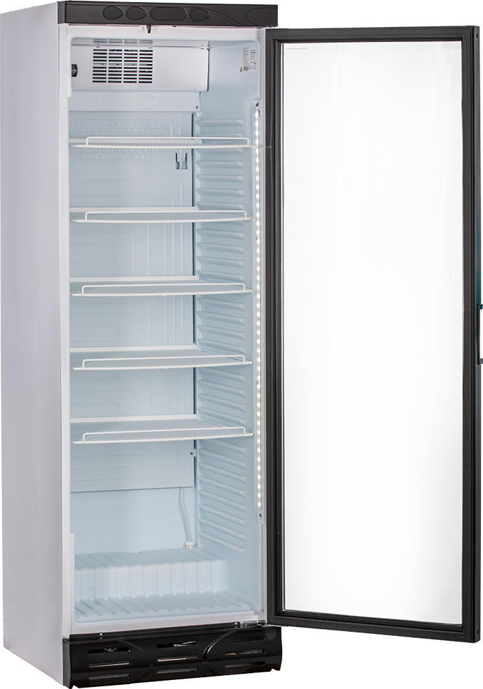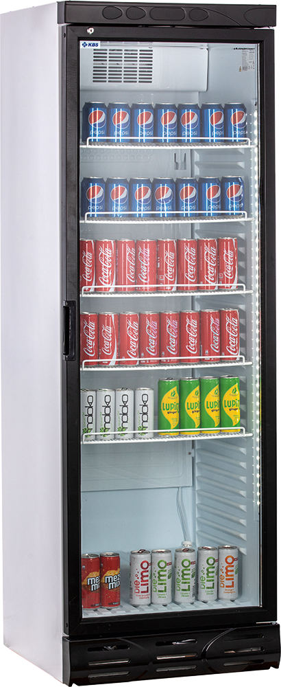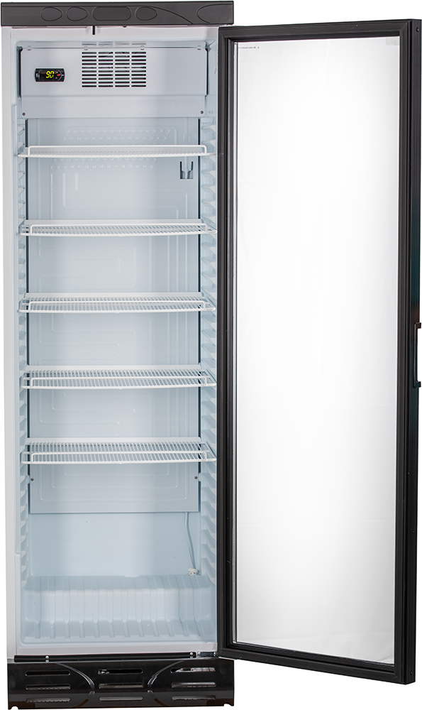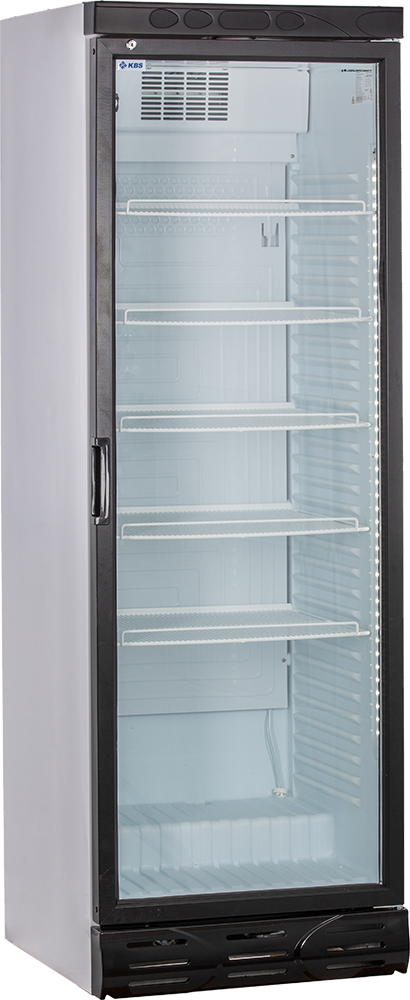 Glastürkühlschrank. Vertikale Innenbeleuchtung, separat schaltbar. Leicht zu reinigender Innenraum. Umluftkühlung. Fugenloser Kunststoff-Innenraum. Vorgeformte Rostauflagen mit 40 mm Abstand. 5 engmaschige Roste. Roste maximal mit 20 kg belastbar. Rostabstand maximal 270 mm. Selbstschließende Isolierglastür mit Schloss. Innenliegende Temperaturanzeige. Türanschlag rechts. Türrahmen schwarz. Leicht wechselbare Türmagnetsteckdichtung. Vorne höhenverstellbare Ausgleichsfüße. Hinten 2 Transportrollen. Individualisierung durch Labelung auf Anfrage lieferbar. Abmessungen außen (B x T x H) 600 x 621 x 1863 mm. Temperaturbereich von 2 °C bis 10 °C. Außenmaterial Stahlblech weiß pulverbeschichtet. Innenmaterial ABS Kunststoff weiß. Anschlußwert 0,267 kW 230 Volt. Bruttogewicht 81 Kg. Serienzubehör 5 Roste max je 20 kg Tragkraft. Kältemittel R 600a (Isobutan)/GWP 3. Bruttoinhalt 362 Liter. Energieverbrauch 785 KWHJ. Energieeffizienzklasse D. Energieeffizienzspektrum A bis G. Energieeffizienzindex EEI 49,1. Klimaklasse CC2. Temperaturklasse K4. EPREL Registrierungsnummer 1407159. EU-Labelverordnung 2019/2018.