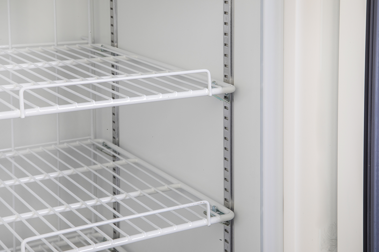 Tiefkühllagerschrank. Stahlblech weiß pulverbeschichtet. Umluftkühlung. Selbstschließende Glastür. Integrierter Griff im Aluminiumrahmen. Elektronische Steuerung. Digitale Temeraturanzeige. 5 höhenverstellbare Roste rilsaniert. 1 Bodenrost rilsaniert. Separat schaltbare Displaybeleuchtung. Separat schaltbare vertikale LED-Innenbeleuchtung. Leicht wechselbare Türmagnetsteckdichtung. Türanschlag rechts. 4 Transportrollen. 2 höhenverstellbare Ausgleichsfüße vorne. Abmessungen außen (B x T x H) 668 x 692 x 1990 mm. Temperaturbereich von -15 °C bis -22 °C. Außenmaterial Stahlblech weiß pulverbeschichtet. Innenmaterial Kunststoff weiß. Anschlußwert 0,580 kW 230 Volt. Bruttogewicht 142 Kg. Serienzubehör 5 höhenverstellbare Roste und 1 Bodenrost weiß rilsaniert. Kältemittel R 290 (Propan)/GWP 3. Bruttoinhalt 403 Liter. Warenpräsentationsfläche (TDA) 0,70 m². Energieverbrauch 2550 KWHJ. Energieeffizienzklasse D. Energieeffizienzspektrum A bis G. Energieeffizienzindex EEI 41. Klimaklasse 4. Temperaturklasse L1. EPREL Registrierungsnummer 1880979. EU-Labelverordnung 2019/2018.