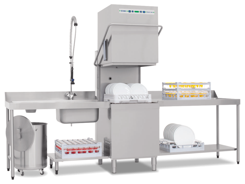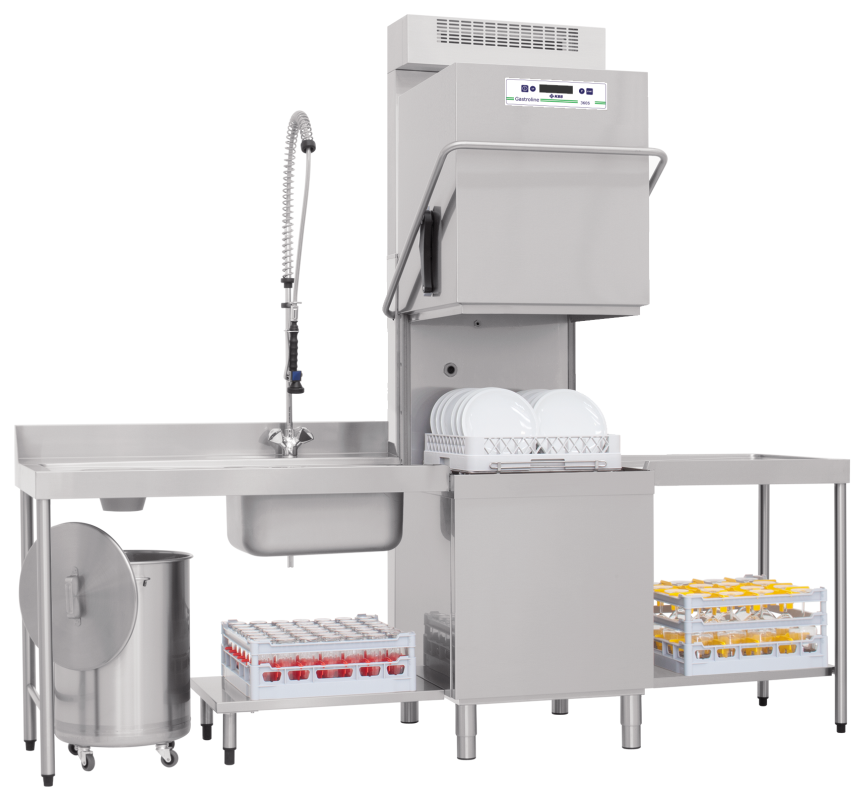 Haubenspülmaschine mit Wärmerückgewinnung. Höhe mit geöffneter Haube 2265 mm. Korbmaß 500×500 mm. Thermostoppfunktion. Ablaufpumpe mit Teilwassertankentleerung. Drucksteigerungspumpe. Elektronisch einstellbare Klar- und Spülmitteldosierpumpe. Wasserenthärter. Multicolour Funktionsdisplay. Elektronische Steuerung mit Soft-Touch Bedienung. Digitale Temperaturanzeige. Doppelwandige Konstruktion. Doppelwandige Tür mit Federentlastung. 3 -Stufen Filtersystem. Tankflächenfilter. Double-Flow Waschpumpe mit Sanftanlauf. Tiefgezogener Tank. Quick-Ready Funktion. Energy Save Funktion. Außen- und Innenmaterial aus CNS. Smart Spül- und Nachspülarm aus Edelstahl. Boilersicherheitsthermostat. Automatische Wasserniveauregulierung. Pumpenschutzsiebe mit Sicherheitssystem. Eingebauter Haubenkontaktschalter. 3 Spülprogramme 55, 90 oder 180 Sekunden. 8 Spezialprogramme. Selbstreinigungsprogramm. Selbstdiagnosesystem. Gerät nicht steckerfertig. Serienzubehör 1 Universalkorb, 1 Tellerkorb und 1 Besteckkorb. Höhenverstellbare Ausgleichsfüße. Bei vorgeschalteter Osmoseanlage muss ein Wärmetauscher aus Edelstahl (Mehrpreisoption) bestellt werden. Abmessungen außen (B x T x H) 788 x 836 x 2265 mm. Außenmaterial Edelstahl AISI 304. Innenmaterial Edelstahl AISI 304. Anschlußwert 12,55 kW 400 Volt. Bruttogewicht 143 Kg. Serienzubehör 1 Neutralkorb, 1 Tellerkorb, 1 Besteckeinsatz.