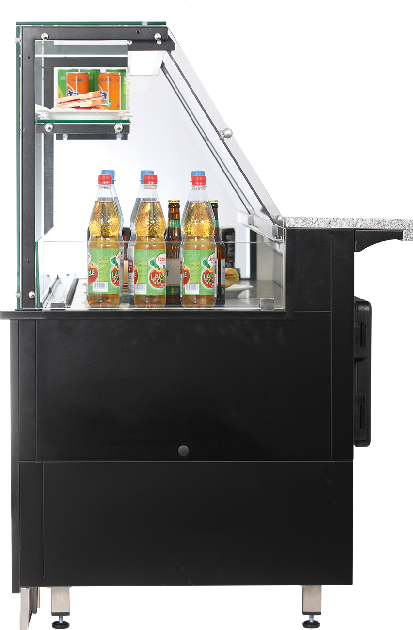Modulares System. Kassentisch. Rückseitige Schublade. Granitarbeitsplatte grau gesprenkelt. Frontplatte Melamine beschichtet. Höhenverstellbare Ausgleichsfüße. Kombinierbar mit Salatbar und Bain-Marie. Für Speisenausgabensysteme in Restaurants und Kleingastronomie. Individuelle Farb- und Darstellungsmöglichkeiten. Ideales Produkt für den Laden- und Gastronomieeinrichter. Abmessungen außen (B x T x H) 1000 x 880 x 890 mm. Außenmaterial Holz Melamine schwarz beschichtet. Bruttogewicht 160 Kg.