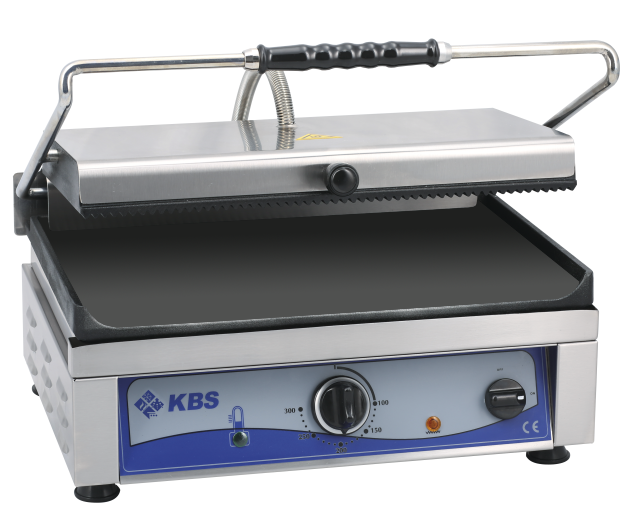 Gerät aus Chromnickelstahl. Grillfläche oben und unten gerillt. Thermostat regelbar von +50 °C bis +300 °C. Grillfläche aus Gusseisen 450 x 270 mm. Betriebskontrollleuchte. Ein-/Ausschalter. Aufheiz-/Temperatur-Kontrollleuchte. Fettauffangschale. Abmessungen außen (B x T x H) 510 x 500 x 300 mm. Temperaturbereich von 50 °C bis 300 °C. Außenmaterial CNS, Grillfläche aus Gusseisen, Kunststoff. Anschlußwert 3 kW 230 Volt. Bruttogewicht 33 Kg. Serienzubehör Fettauffangschale.