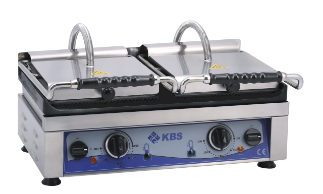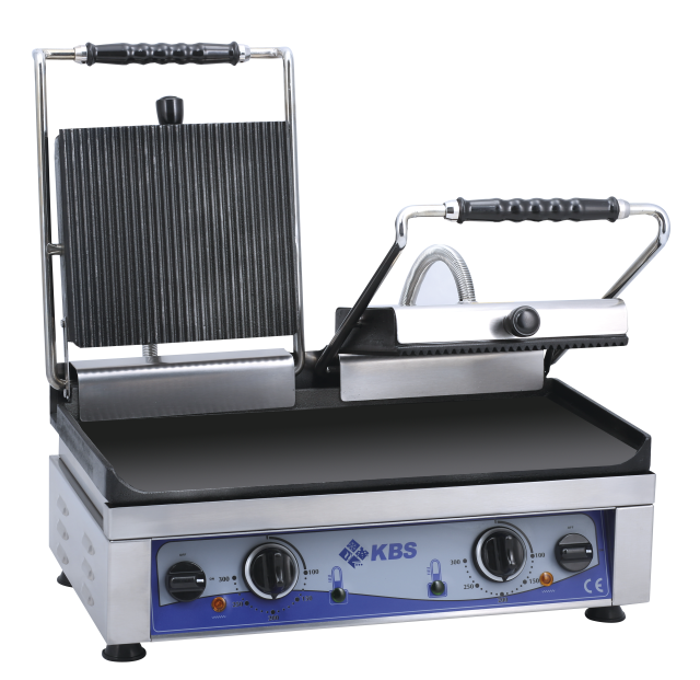 Gerät aus Chromnickelstahl. Grillfläche oben gerillt und unten glatt. 2 getrennte Thermostate regelbar von +50 °C bis +300 °C. Getrennte Temperaturregelung der Grillfläche links- bzw. rechtsseitig. Grillfläche aus Gusseisen mit keramischer Beschichtung 520 x 240 mm. Betriebskontrollleuchte. Ein-/Ausschalter. Aufheiz-/Temperatur-Kontrollleuchte. Fettauffangschale. Abmessungen außen (B x T x H) 560 x 440 x 300 mm. Temperaturbereich von 50 °C bis 300 °C. Außenmaterial CNS, Grillflächen aus Gusseisen, Kunststoff. Anschlußwert 3,5 kW 230 Volt. Bruttogewicht 43 Kg. Serienzubehör Fettauffangschale.