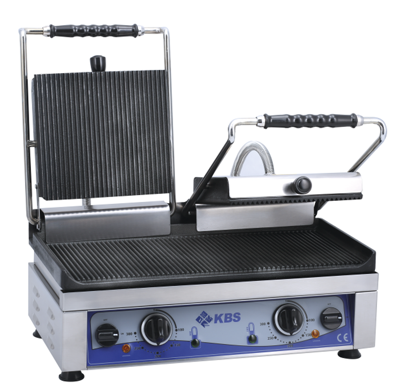 Gerät aus Chromnickelstahl. Grillfläche oben und unten gerillt. 2 getrennte Thermostate regelbar von +50 °C bis +300 °C. Getrennte Temperaturregelung der Grillfläche links- / rechtsseitig. Grillfläche aus Gusseisen mit keramischer Beschichtung 520 x 240 mm. Betriebskontrollleuchte. Ein-/Ausschalter. Aufheiz-/Temperatur-Kontrollleuchte. Fettauffangschale. Abmessungen außen (B x T x H) 560 x 440 x 300 mm. Temperaturbereich von 50 °C bis 100 °C. Außenmaterial CNS, Grillflächen aus Gusseisen, Kunststoff. Anschlußwert 3,5 kW 230 Volt. Bruttogewicht 43 Kg. Serienzubehör Fettauffangschale.