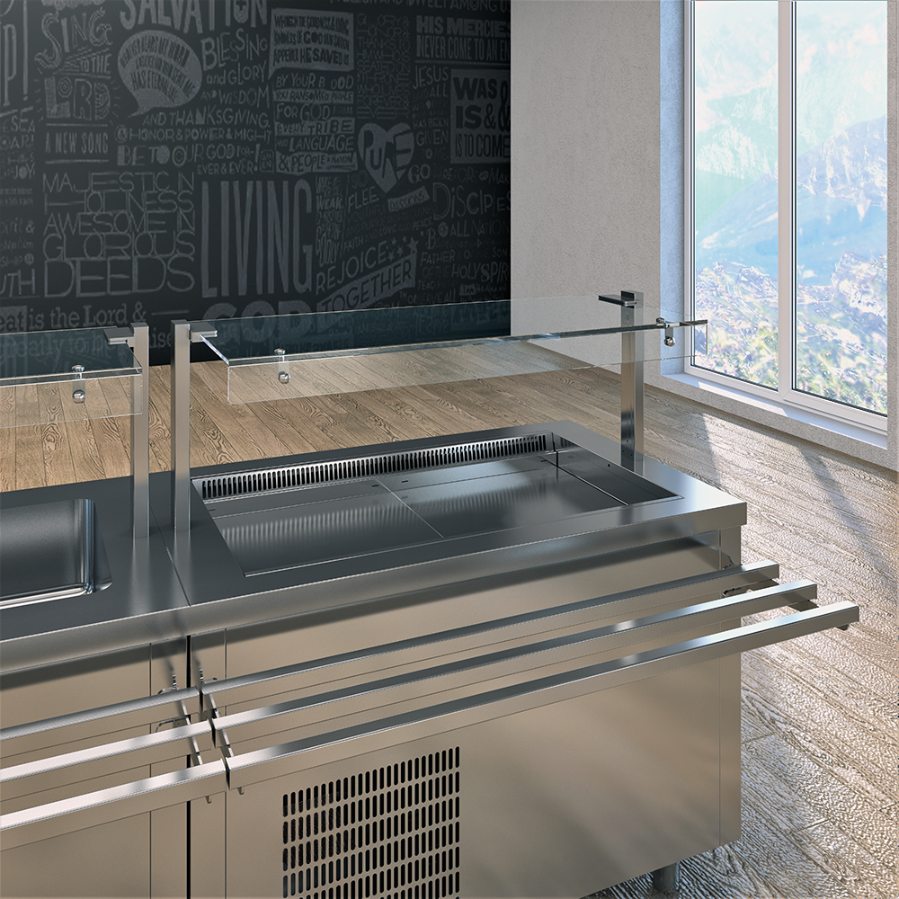 Professionelle Kühlwanne mit Umluftkühlung und gekühltem Luftschleier für GN-Behälter bis 40 mm. Eingeschäumter, klappbarer Verdampfer für einfache Reinigung. Elektronische Steuerung mit digitaler Anzeige. Edelstahl-Unterbau mit offenem Fach. Teil eines modularen Speisenausgabesystems – ideal für Gastronomie, Kantinen und Ladenbau. Individuell konfigurierbar und erweiterbar.