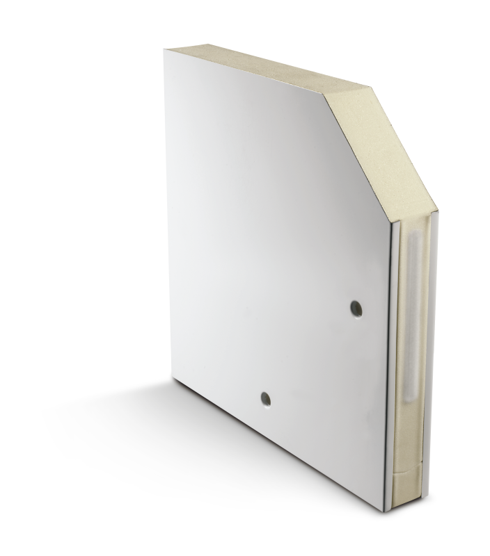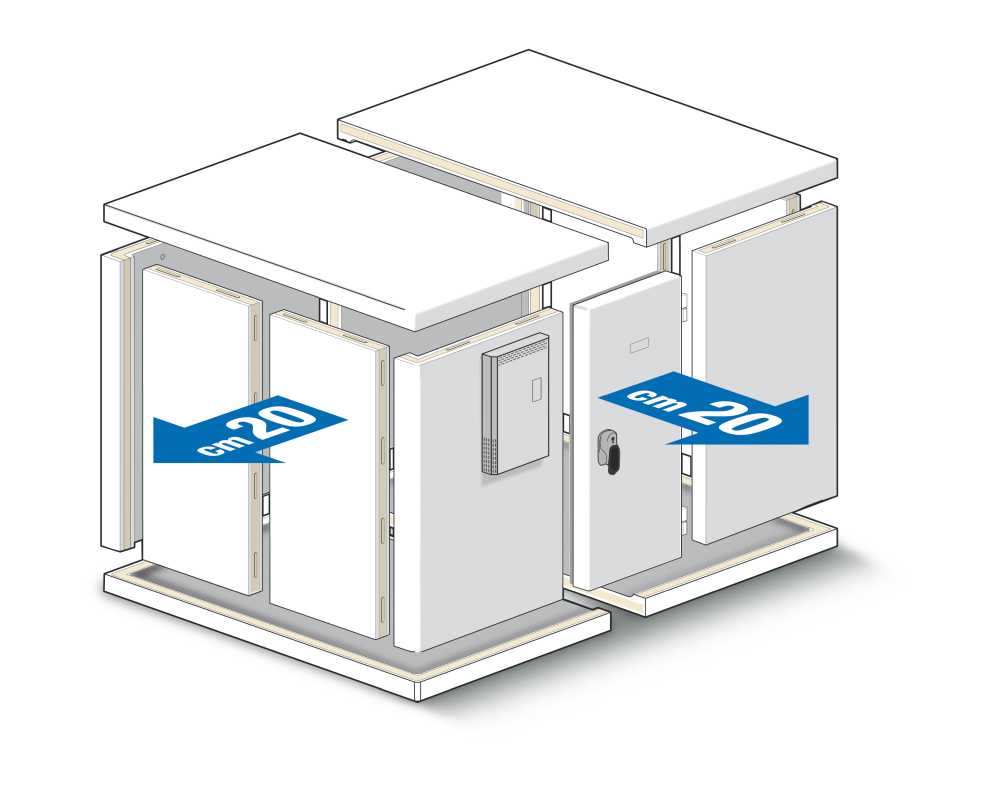 Abgerundete Ecken für bessere Hygiene. Boden für max. statische Last von 1500 kg/m,² nicht befahrbar. Boden zum Schutz beschichtet mit 200 Mikron starkem grauem, rutschfestem PVC-Film. Wände und Deckenelemente aus verzinktem Stahlblech weiß RAL 9010. Isolierung 80 mm. K-Wert: 0,29W/m². Nach DIN EN 13501-1 (entspricht DIN-4102). Brandklasse B1 schwerentflammbar. Leichte Montage durch exzentrische Doppeleffekthaken, kältebrückenfrei fixiert. Eingeschäumte Hakenverschlüsse. Tür mit Schloss und Paniksicherung. Türlichtenmaß B x H 800 x 1900 mm. Tür halbaufliegend. Türanschlag rechts, wechselbar. Tür nur in der langen Seite gemäß Skizzen montierbar. Bodenunterbelüftungsplatten inklusive Verlegeplan gegen Mehrpreis lieferbar. Abmessungen außen (B x T x H) 1980 x 1980 x 2180 mm. Außenmaterial Stahlblech weiß RAL 9010. Innenmaterial Stahlblech weiß RAL 9010, Boden grau. Bruttogewicht 610 Kg.