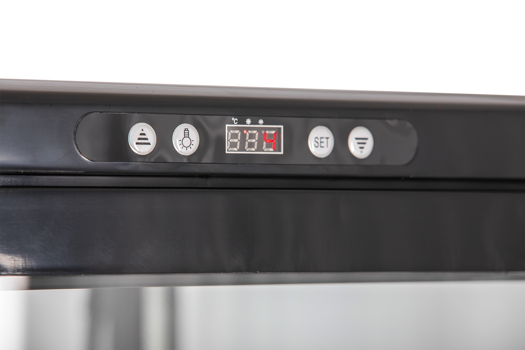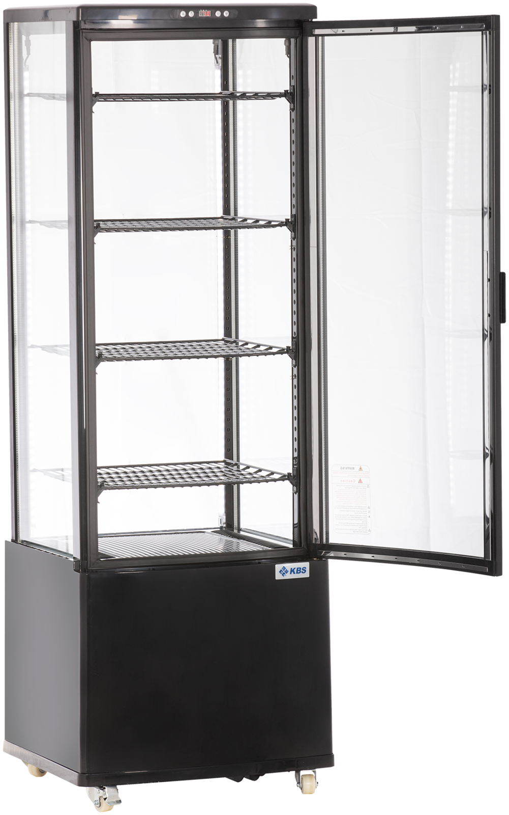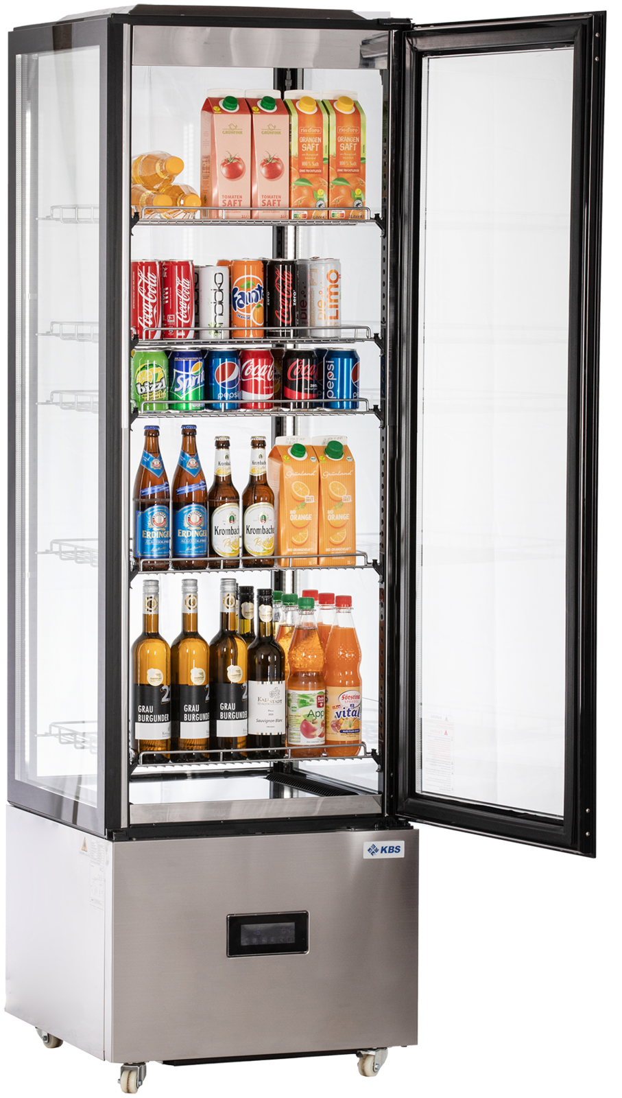Ideal für Getränke und verpackte Lebensmittel. 4-seitige Panoramaisolierverglasung. Tür nicht überstehend. Tür mit Schloss. Servicefreundliche Türmagnetsteckdichtung. Elektronische Steuerung. Separate Beleuchtungstaste. 2 vertikale LED Lampen. Umluftkühlung. Optimiertes Luftleitsystem im Innenraum. Automatische Abtauung und Tauwasserverdunstung. 4 CHR Roste höhenverstellbar. Türanschlag rechts. Abmessungen außen (B x T x H) 556 x 526 x 1613 mm. Temperaturbereich von 2 °C bis 12 °C. Bestückungsmöglichkeit Roste. Außenmaterial ABS-Kunststoff. Innenmaterial PVC, CHR. Anschlußwert 0,38 kW 230 Volt. Bruttogewicht 78 Kg. Serienzubehör 4 Roste CHR. Kältemittel R 290 (Propan)/GWP 3. Bruttoinhalt 215 Liter. Warenpräsentationsfläche (TDA) 1,61 m². Energieverbrauch 1946 KWHJ. Energieeffizienzklasse C. Energieeffizienzspektrum A bis G. Energieeffizienzindex EEI 20,0. Klimaklasse 4. Temperaturklasse M2. EPREL Registrierungsnummer 2293978. EU-Labelverordnung 2019/2018.