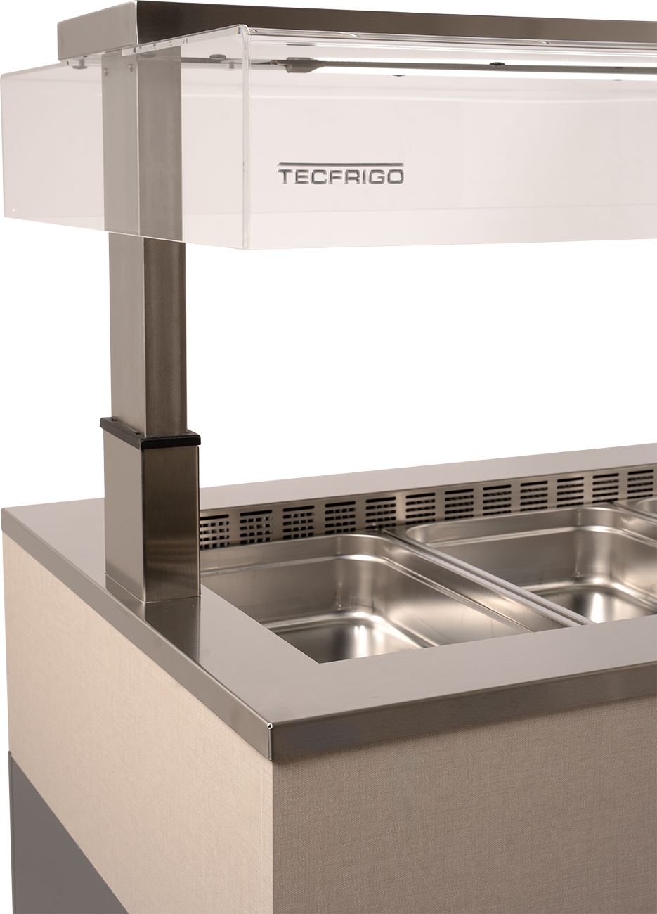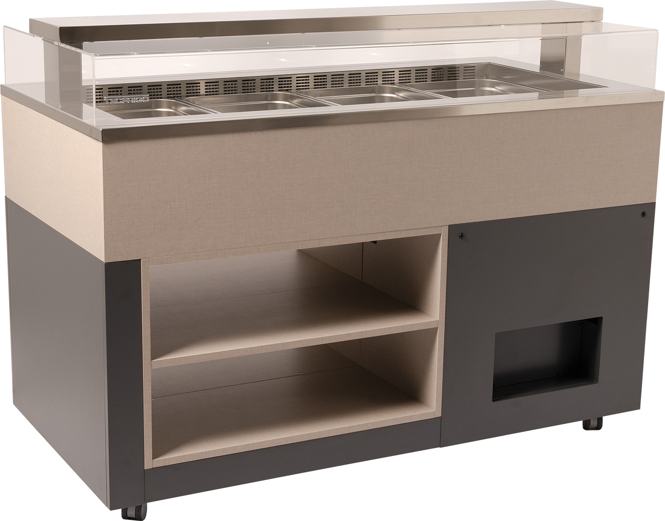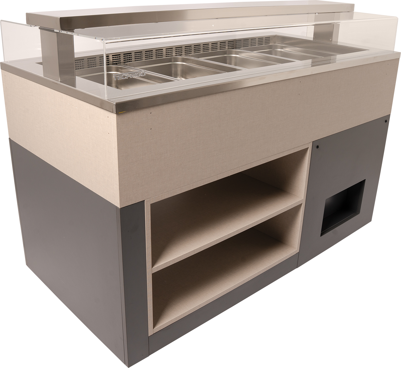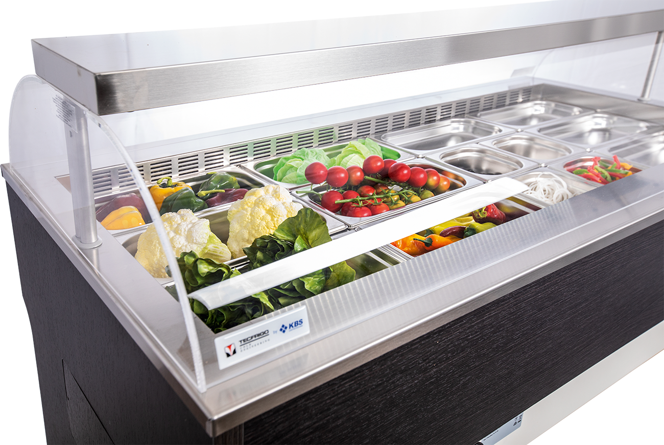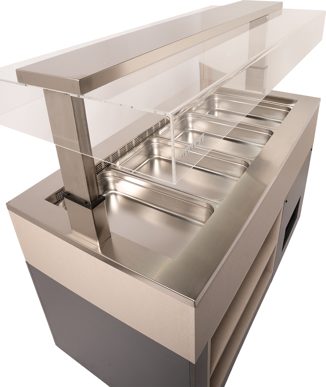 Professionelle Salatbar / Frühstücksbuffet für den Buffetbereich in Hotellerie und Gastronomie. Elegante Außenverkleidung in graphitgrauer Holzoptik, Innenwannen aus Edelstahl AISI 304. Stille Kühlung mit R290, automatische Abtauung. Höhenverstellbarer, elektrischer Plexiglas-Hustenschutz, LED-Beleuchtung 3000–6500 K, digitale Temperaturanzeige und Soft-Touch-Steuerung. Optional mit Tablettrutschen.