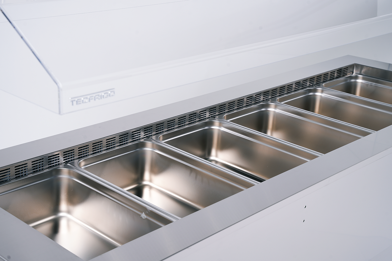 Professionelle Salatbar / Frühstücksbuffet für den Buffetbereich in Hotellerie und Gastronomie. Elegante Außenverkleidung in graphitgrauer Holzoptik, Innenwannen aus Edelstahl AISI 304. Stille Kühlung mit R290, automatische Abtauung. Höhenverstellbarer, elektrischer Plexiglas-Hustenschutz, LED-Beleuchtung 3000–6500 K, digitale Temperaturanzeige und Soft-Touch-Steuerung. Optional mit Tablettrutschen.