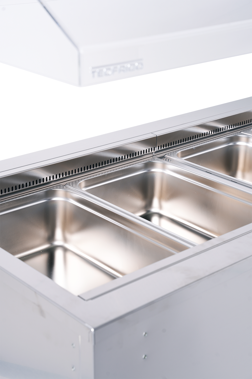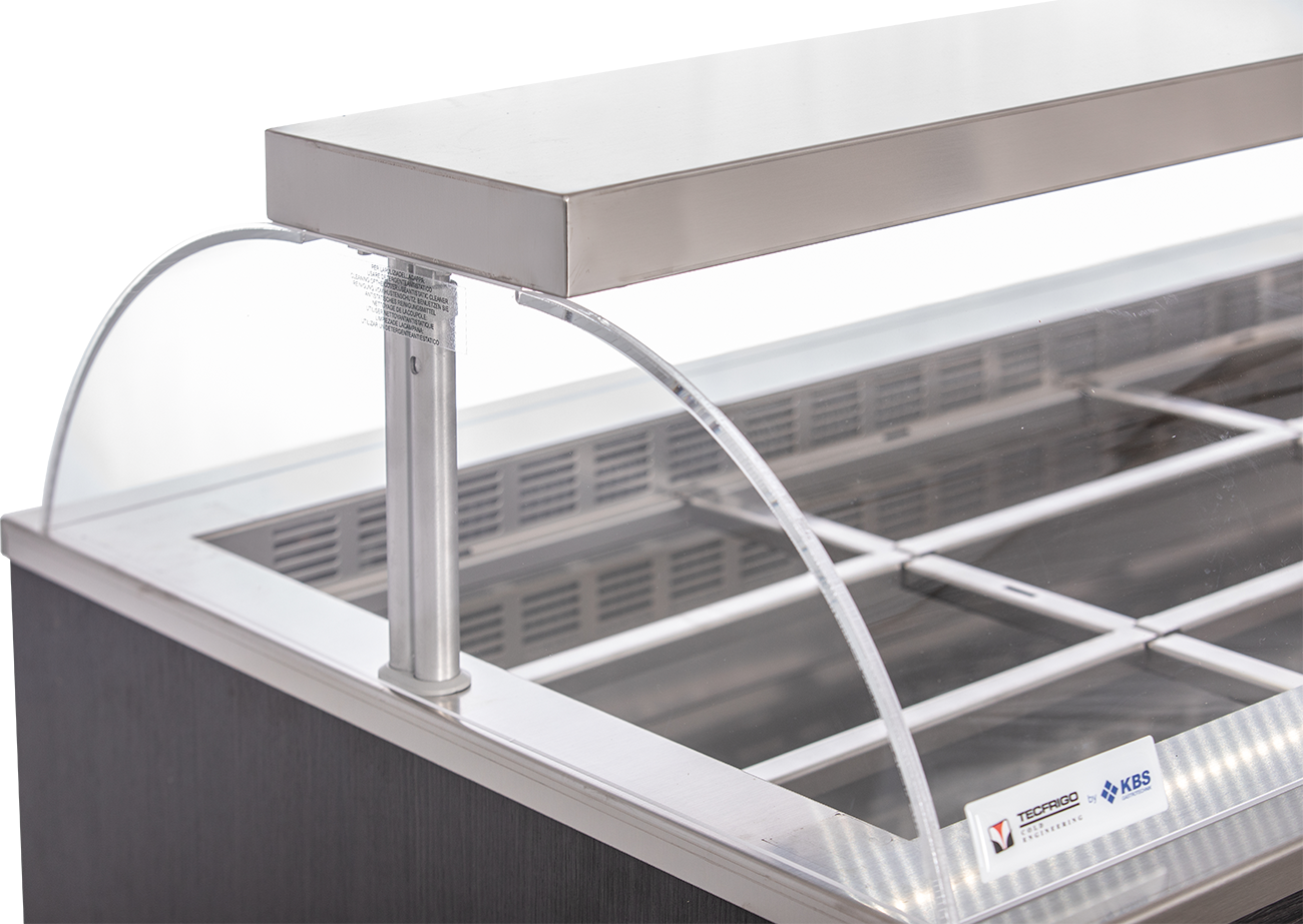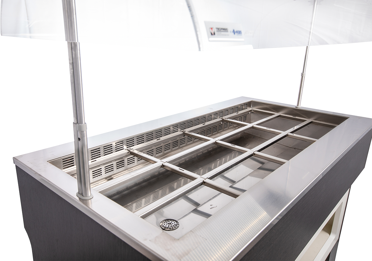 Tiefe mit Tablettrutsche 1154 mm. Höhe mit geöffneter Haube 1528 mm. Möbelstruktur mit laminiertem Holz in Wenge. Front- und Rückwand beige lackiert. Plexiglas-Hustenschutz absenkbar. Elektrische Haubenbetätigung, separat schaltbar. Hustenschutzablagefläche aus CNS gefertigt. LED-Innenbeleuchtung, separat schaltbar. Abklappbare Tablettrutschen mit laminiertem Wengeholz und umlaufender Lackierung in beige. Elektronische Steuerung. Digitale Temperaturanzeige. Automatische Abtauung. CNS Wanne mit front- und rückseitigem beschichtetem Verdampfer. Bestückung mit GN 1/1-Behälter bis max. 150 mm Höhe. 4 Rollen, davon 2 mit Feststellern. Abmessungen außen (B x T x H) 1414 x 750 x 1528 mm. Temperaturbereich von 4 °C bis 10 °C. Bestückungsmöglichkeit GN 1/1. Außenmaterial Holz laminiert Wenge und hell beige. Innenmaterial CNS Wanne. Anschlußwert 0,355 kW 230 Volt. Bruttogewicht 150 Kg. Serienzubehör elektrische Haubenbetätigung, Rollen. Kältemittel R 290 (Propan)/GWP 3.