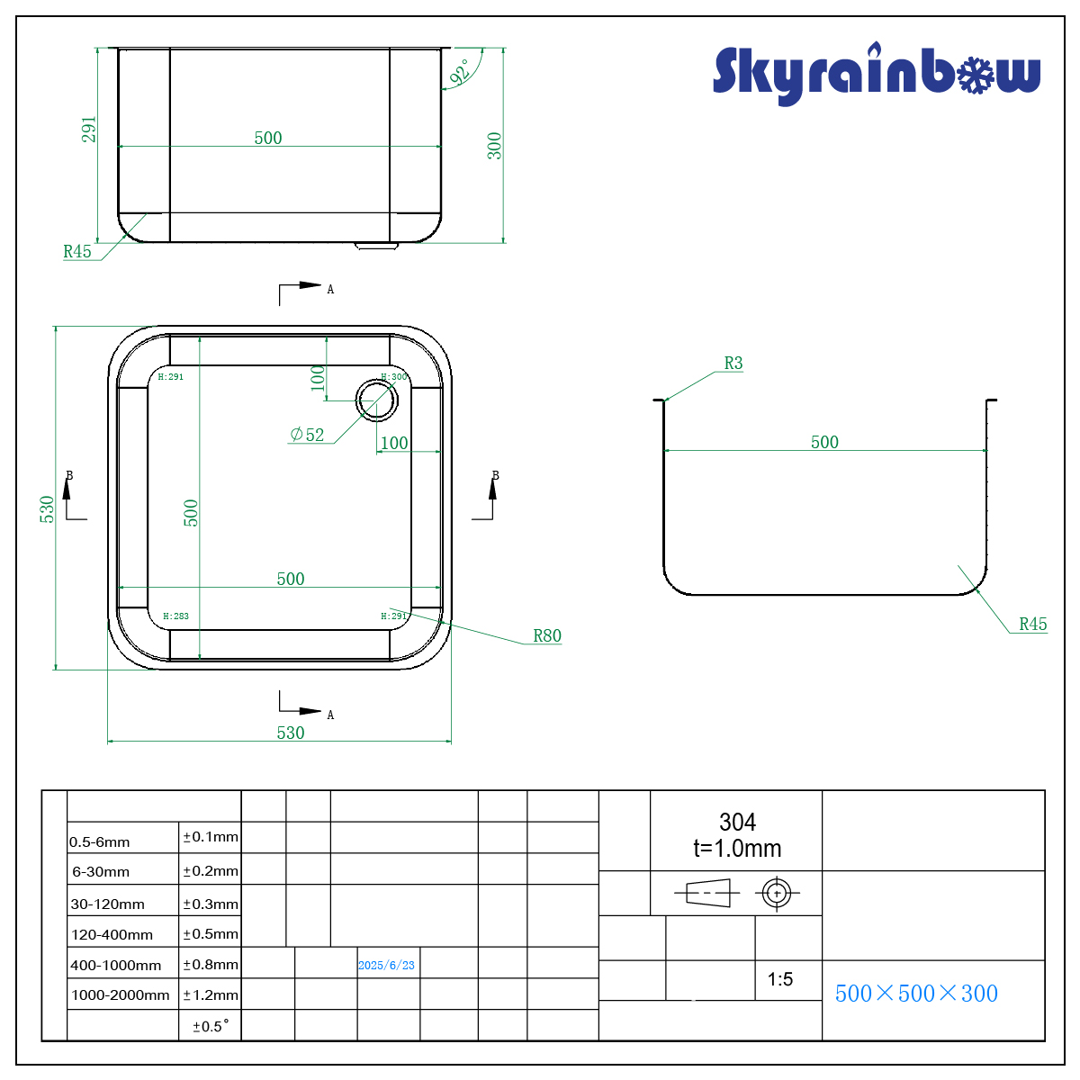 Skyrainbow Edelstahl-Einschweißbecken 500x500x300mm