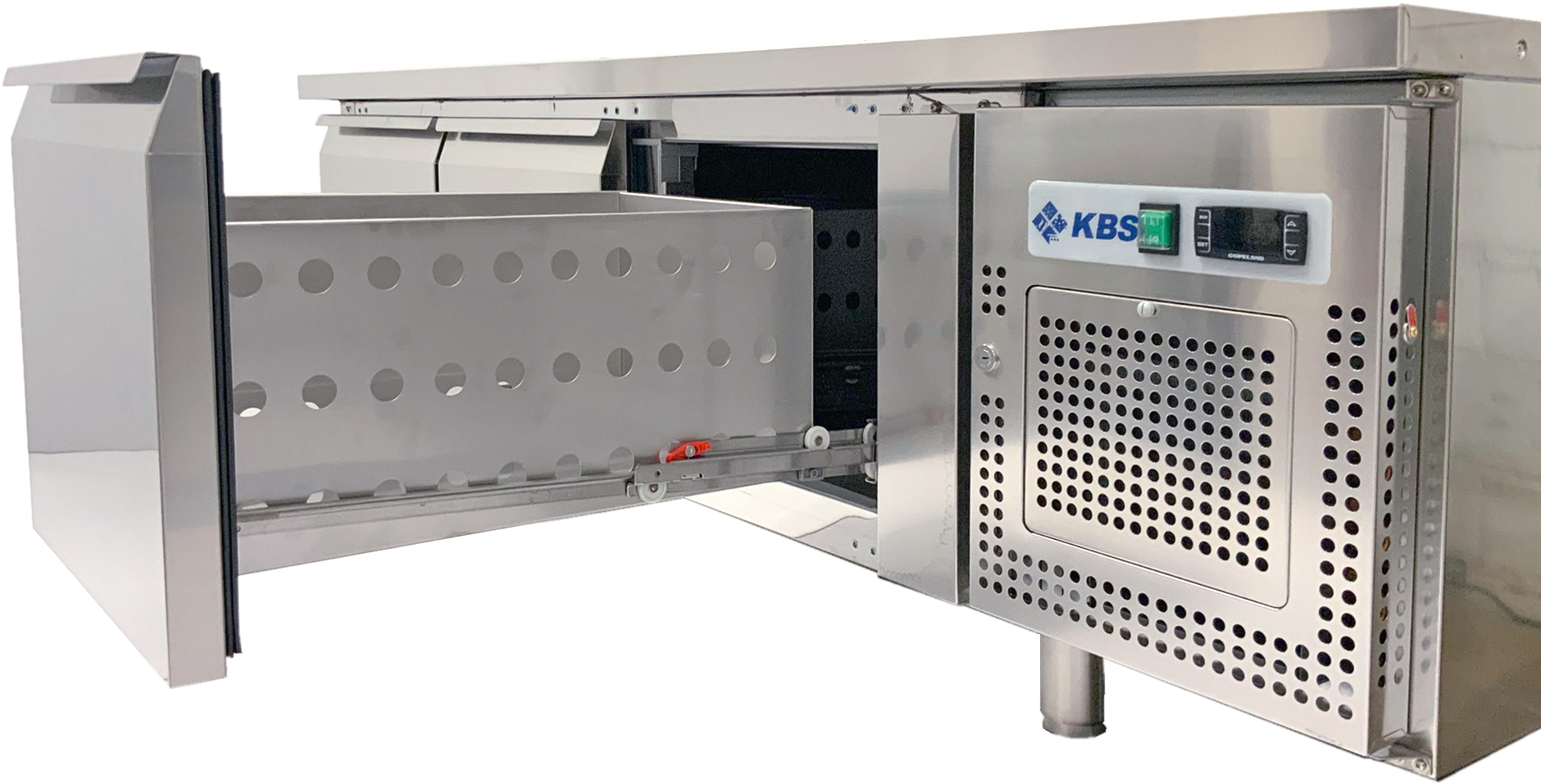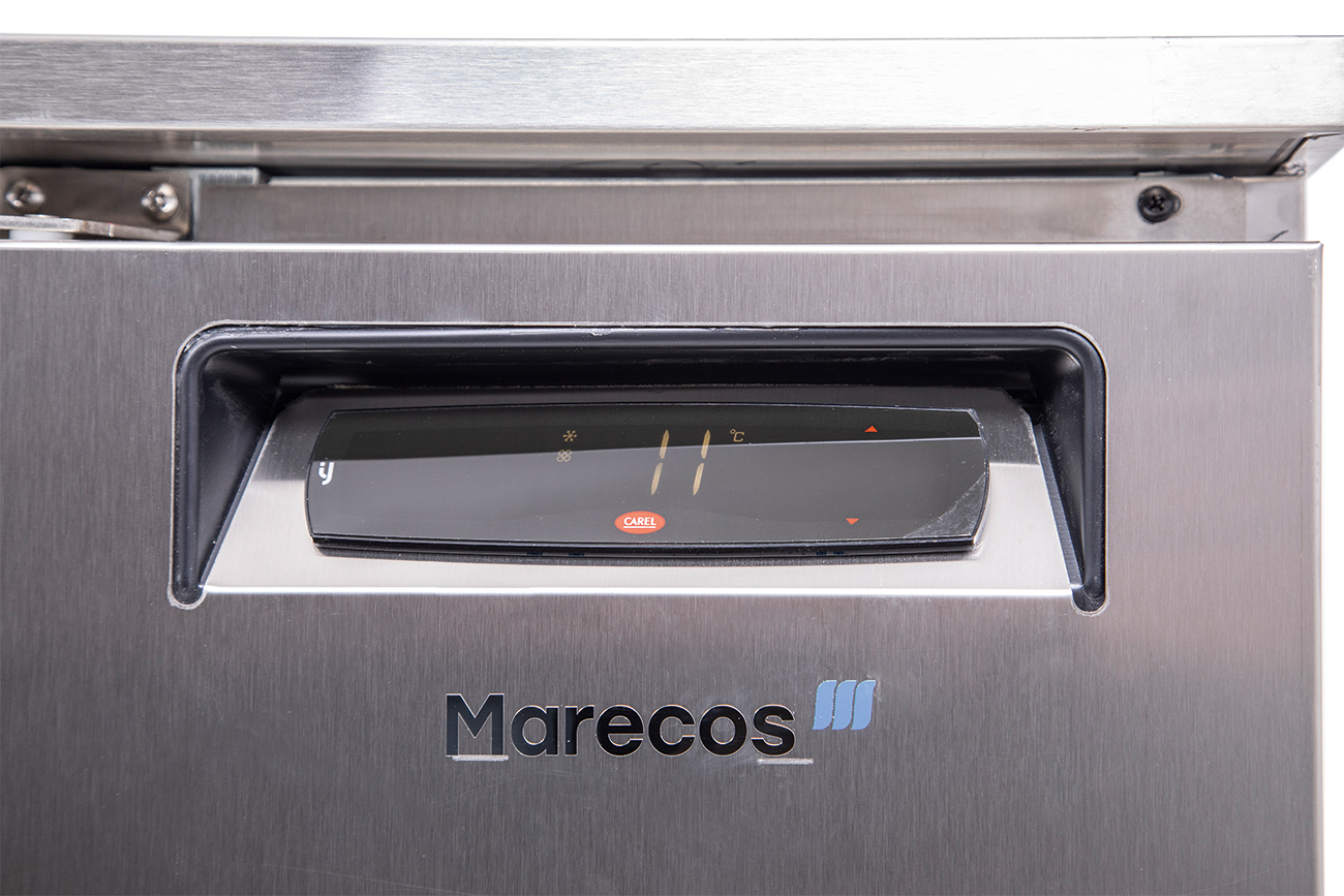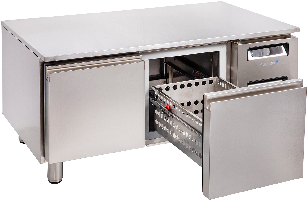 Unterbaukühltisch. Serie UKT. Mit Arbeitsplatte. 2 Schubladen. Schubladen für Schalen. Elektronische Steuerung. Digitale Temperaturanzeige. Boden im Kühltisch als Wanne ausgebildet. Automatische Abtauung. Energiesparende Tauwasserverdunstung. 60mm Isolierung. Leicht wechselbare Magnetsteckdichtungen an den Schubladen. Höhenverstellbare CNS-Füße. Abmessungen außen (B x T x H) 1360 x 700 x 650 mm. Temperaturbereich von -2 °C bis 8 °C. Außenmaterial CNS Chromnickelstahl 18/10. Innenmaterial CNS Chromnickelstahl 18/10. Anschlußwert 0,150 kW 230 Volt. Bruttogewicht 105 Kg. Kältemittel R 600a (Isobutan)/GWP 3. Bruttoinhalt 92 Liter. Energieverbrauch 774 KWHJ. Energieeffizienzklasse C. Energieeffizienzspektrum A +++ bis G. Energieeffizienzindex EEI 38,20. Klimaklasse 4. EPREL Registrierungsnummer 2321820. EU-Labelverordnung 2015/1094-IV.