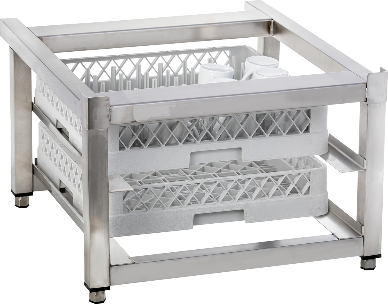 Mit Auflagewinkeln für Körbe. Euro-Wannen und -Boxen 600 x 400 geeignet. Abmessungen außen (B x T x H) 605 x 703 x 422 mm. Bruttogewicht 15 Kg.